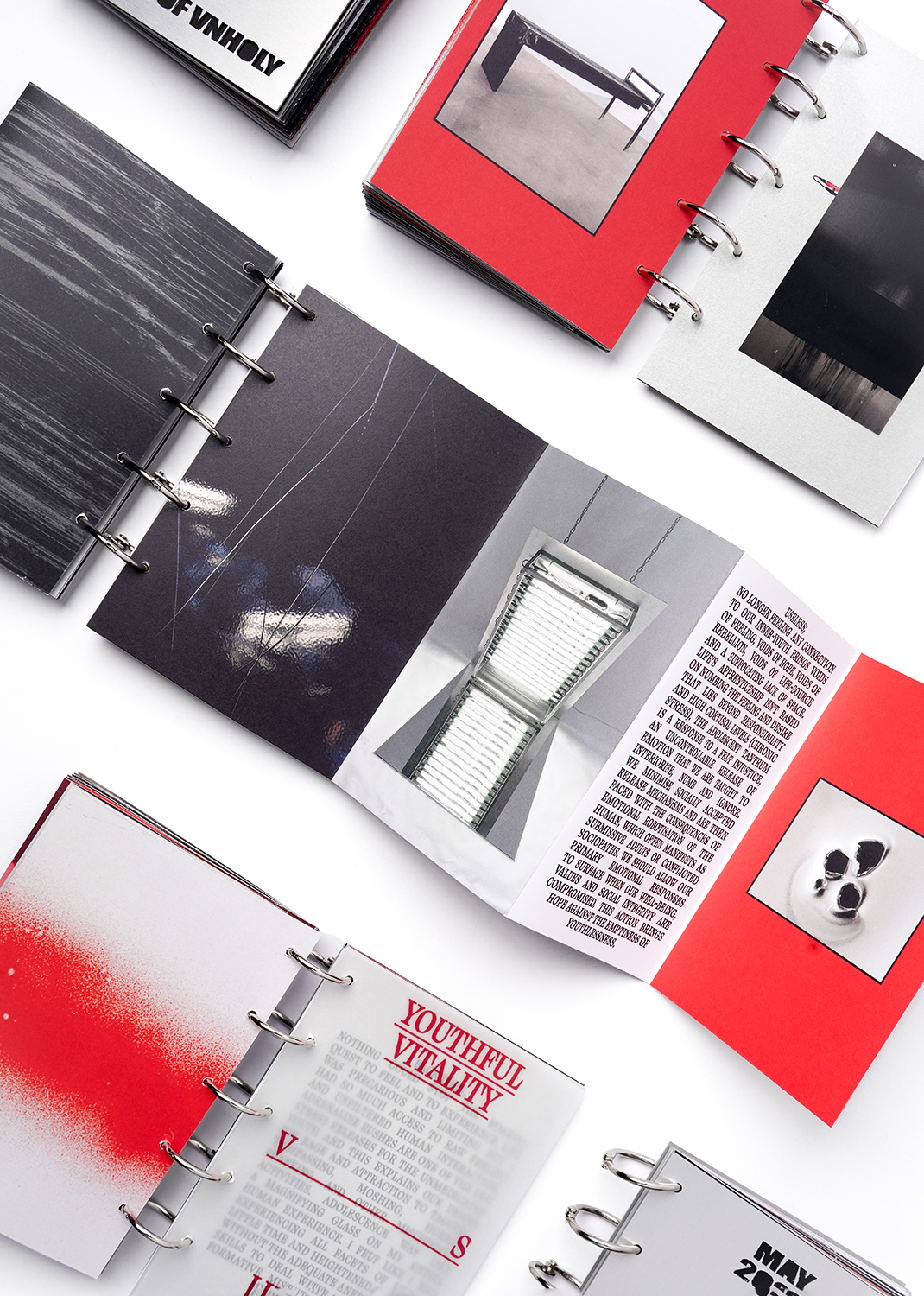 LIFELESS:BOOK, 2025 A multi-medium assemblage that reflects the experiential approach to the LIFELESS exhibition. Anodised aluminium, black card 210gsm, vellum paper, metallic paper, transparency paper, card and metal rings 105W X 148H X 20D