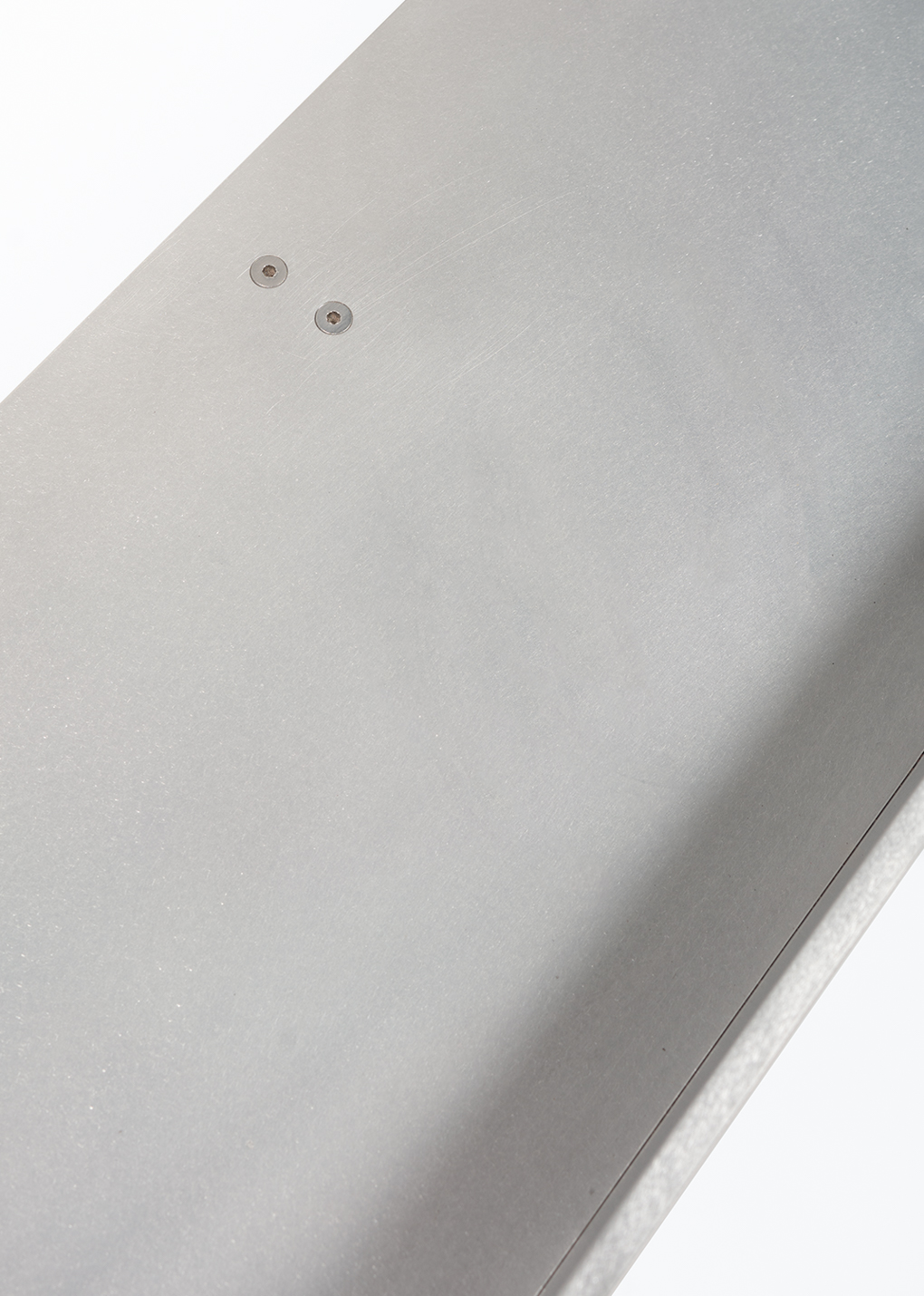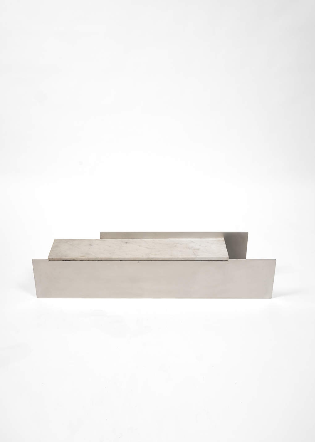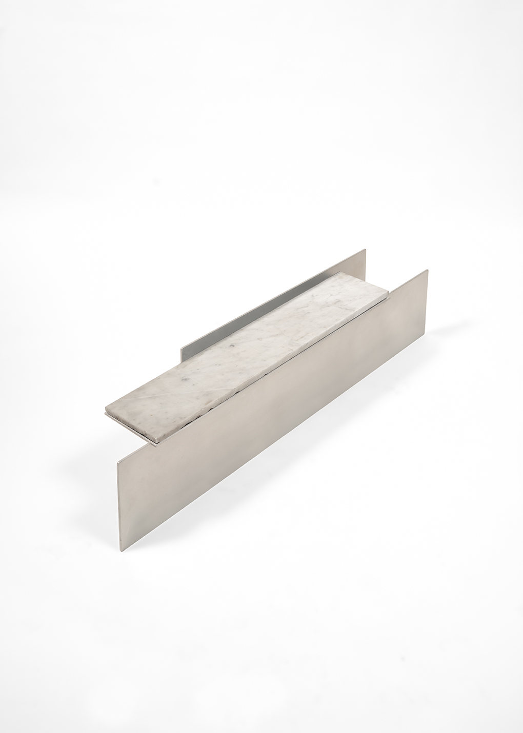 Surface 003 Wall Shelf by Claire Markwick-Smith. Made with sanded aluminium, stainless steel fittings and found marble. Manufactured 2024 with some minor signs of use.